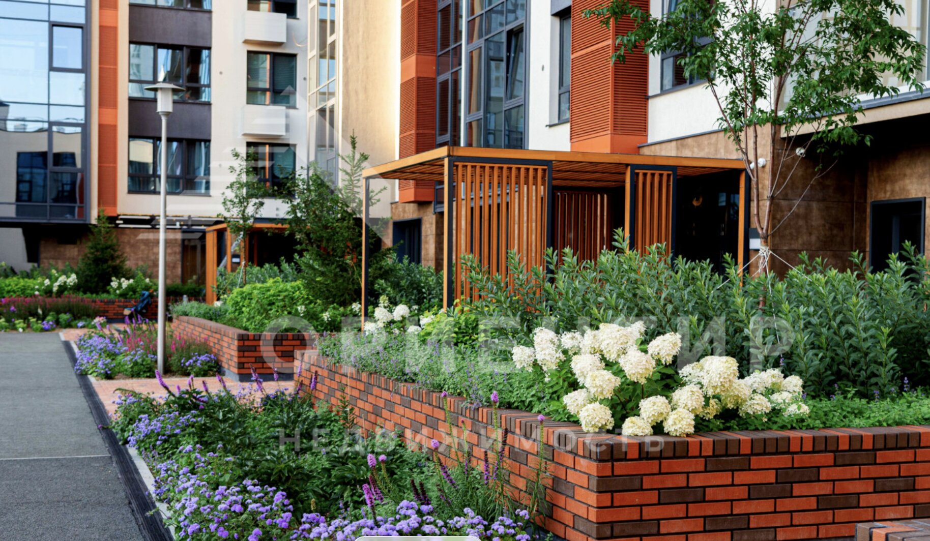 Главной концепцией оформления территории комплекса является закрытый «всегда цветущий двор-сад» с ландшафтным оформлением и приятной музыкой в стиле lounge.