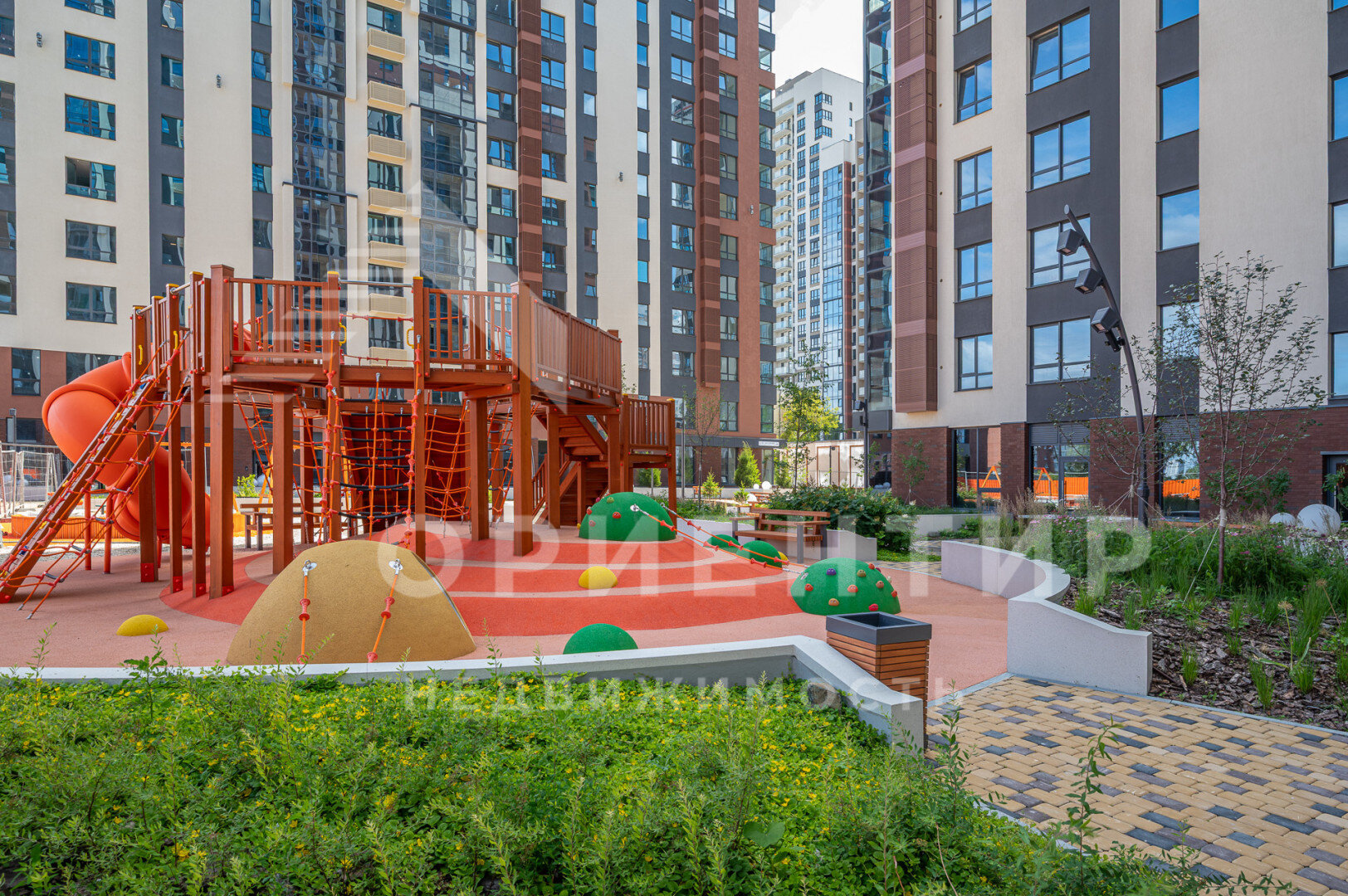 Главной концепцией оформления территории комплекса является закрытый «всегда цветущий двор-сад» с ландшафтным оформлением и приятной музыкой в стиле lounge.