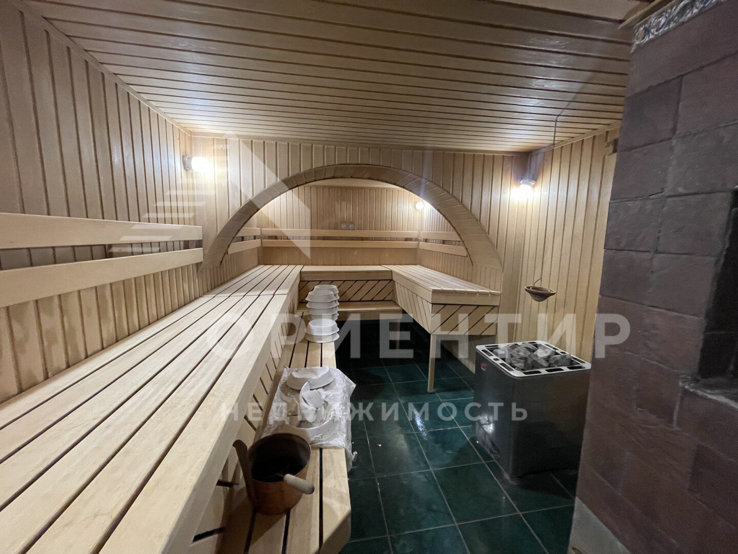 На первом этаже банного комплекса расположены баня, комната отдыха с большим диваном и телевизором, бассейн( Ширина 4м -Длина 3м -Глубина 2м), небольшая кухня, с выходом на веранду, санузел. На втором этаже банного комплекса тренажерный зал, бильярдная комната и зимний сад. На третьем этаже банного комплекса большая спальня со своим санузлом.